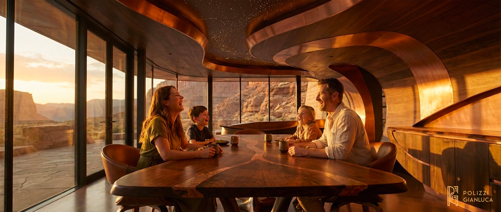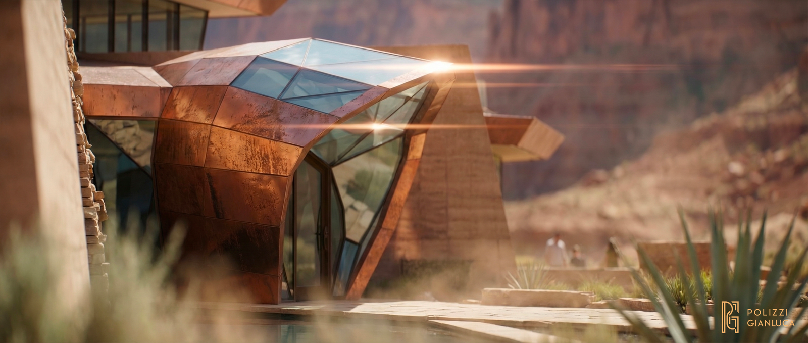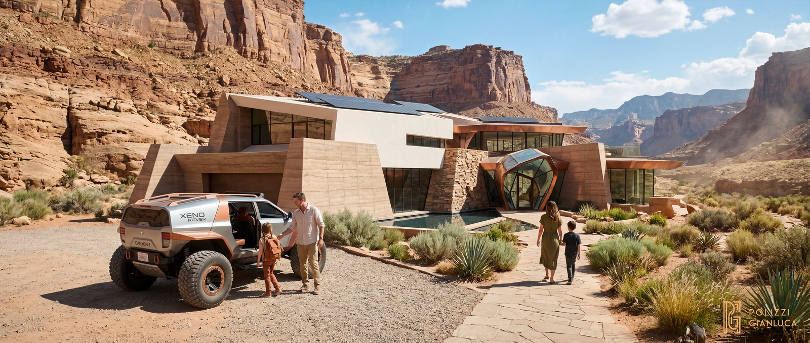 Obiettivo: Visualizzare una villa di lusso sostenibile integrata in un aspro canyon desertico, con particolare attenzione all’architettura in rame e alla tecnologia solare.