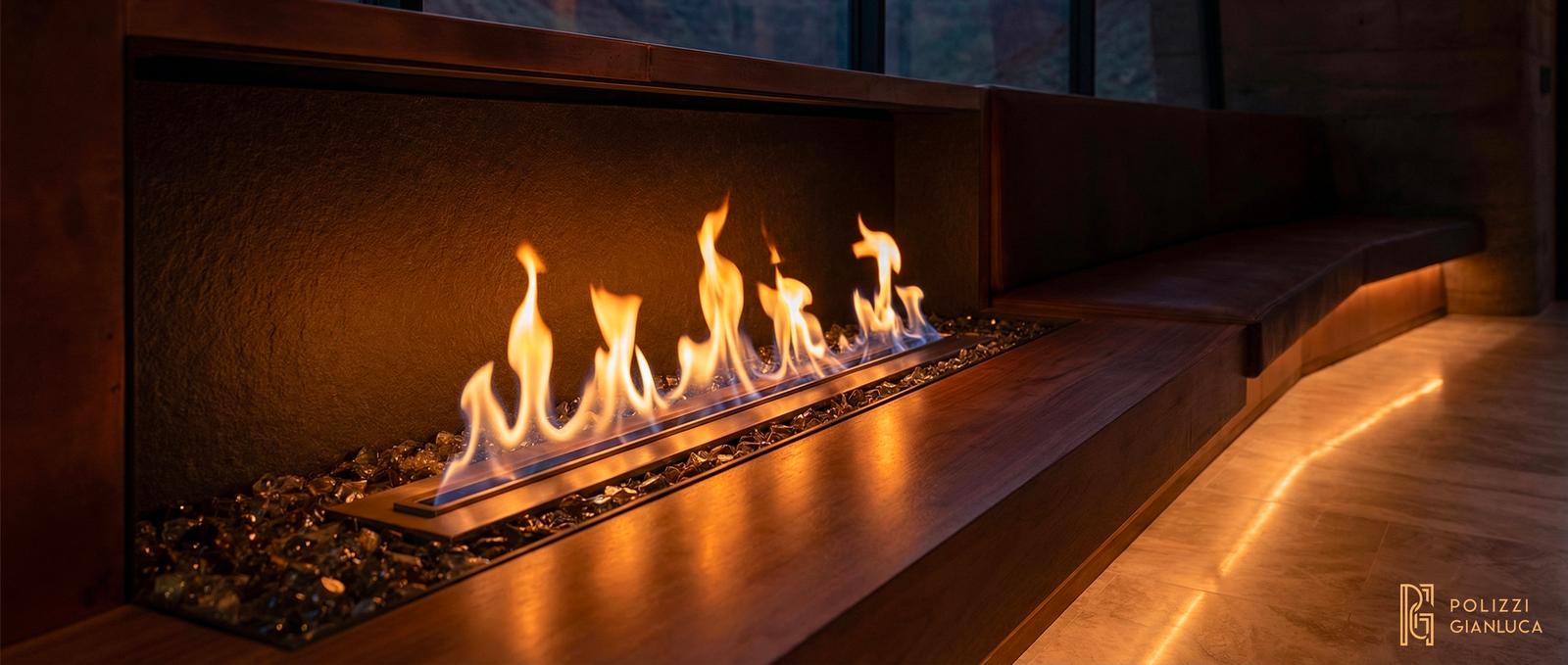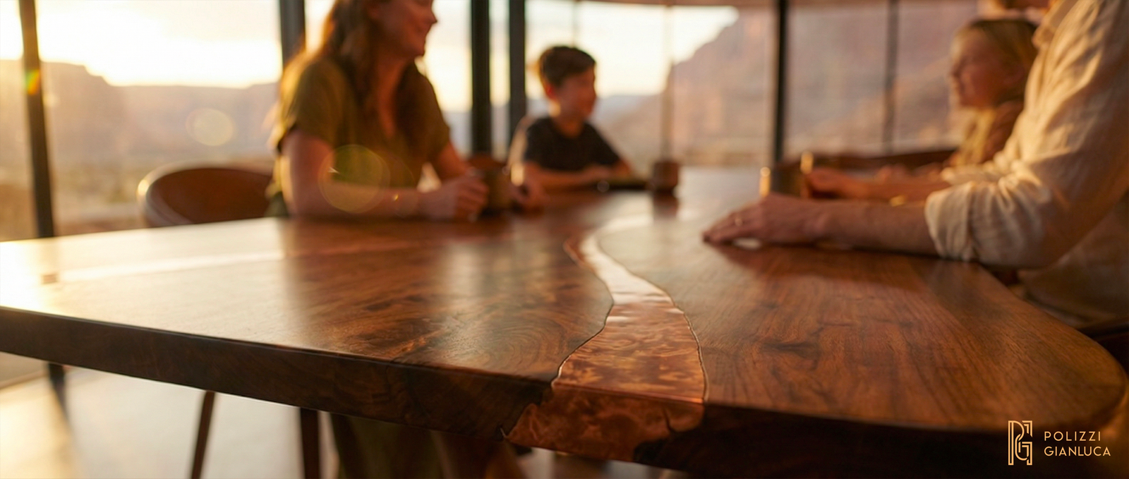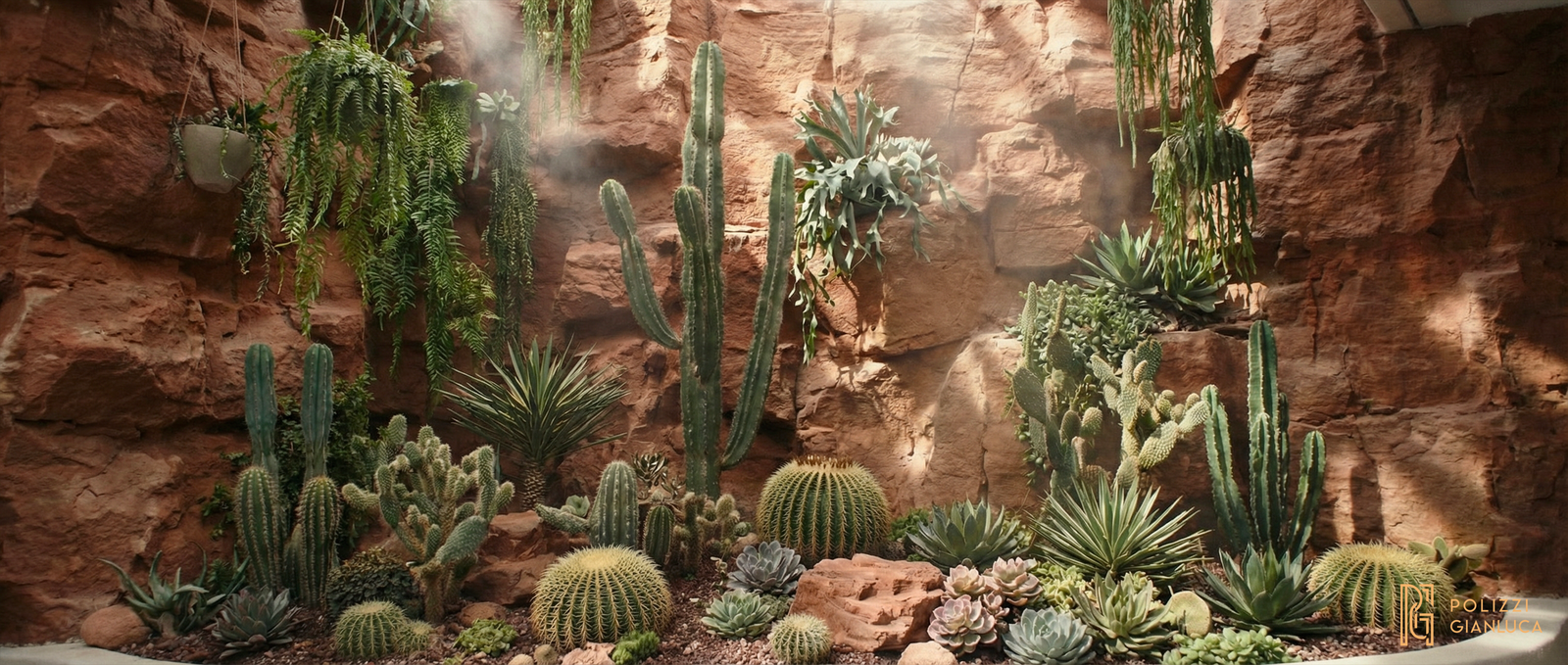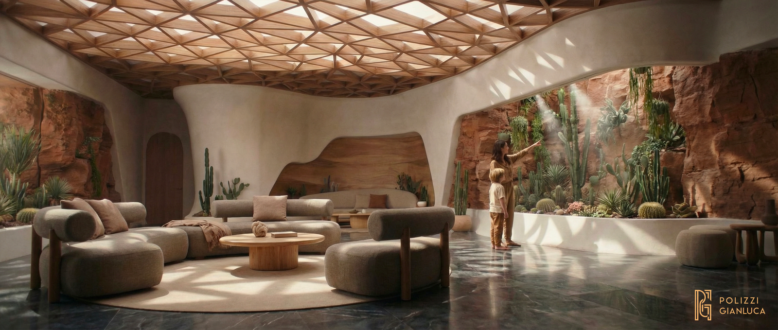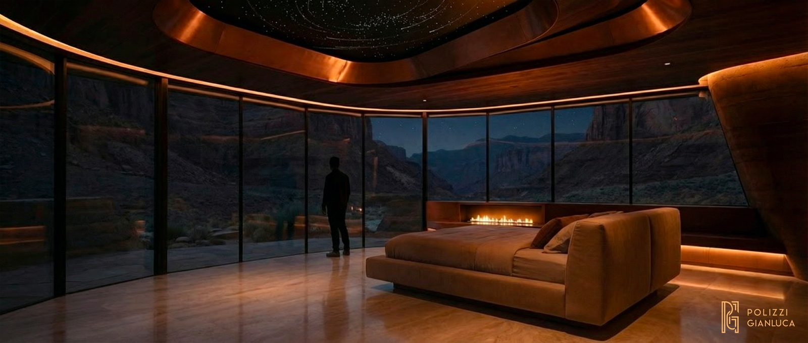 Soluzione: Ho creato un’illuminazione calda, tipica del tramonto, per creare un contrasto tra la roccia rossa e l’elegante rivestimento in rame e le finiture interne in legno. Tra gli elementi chiave figurano un soffitto a costellazioni, un giardino interno di cactus e un tavolo su misura in rame con effetto fiume.
